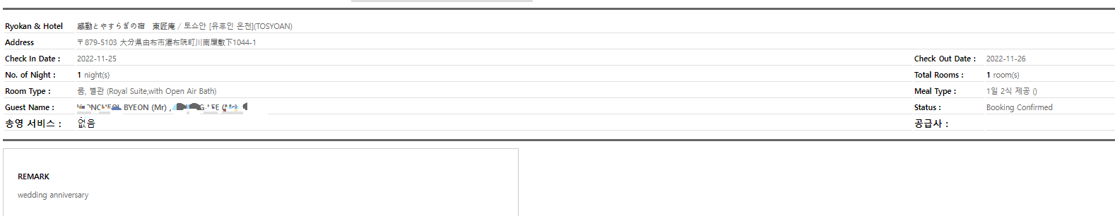2019년 11월 25일에 쿠로카와 호잔테이에서 전여친 현와이프와 결혼기념일마다