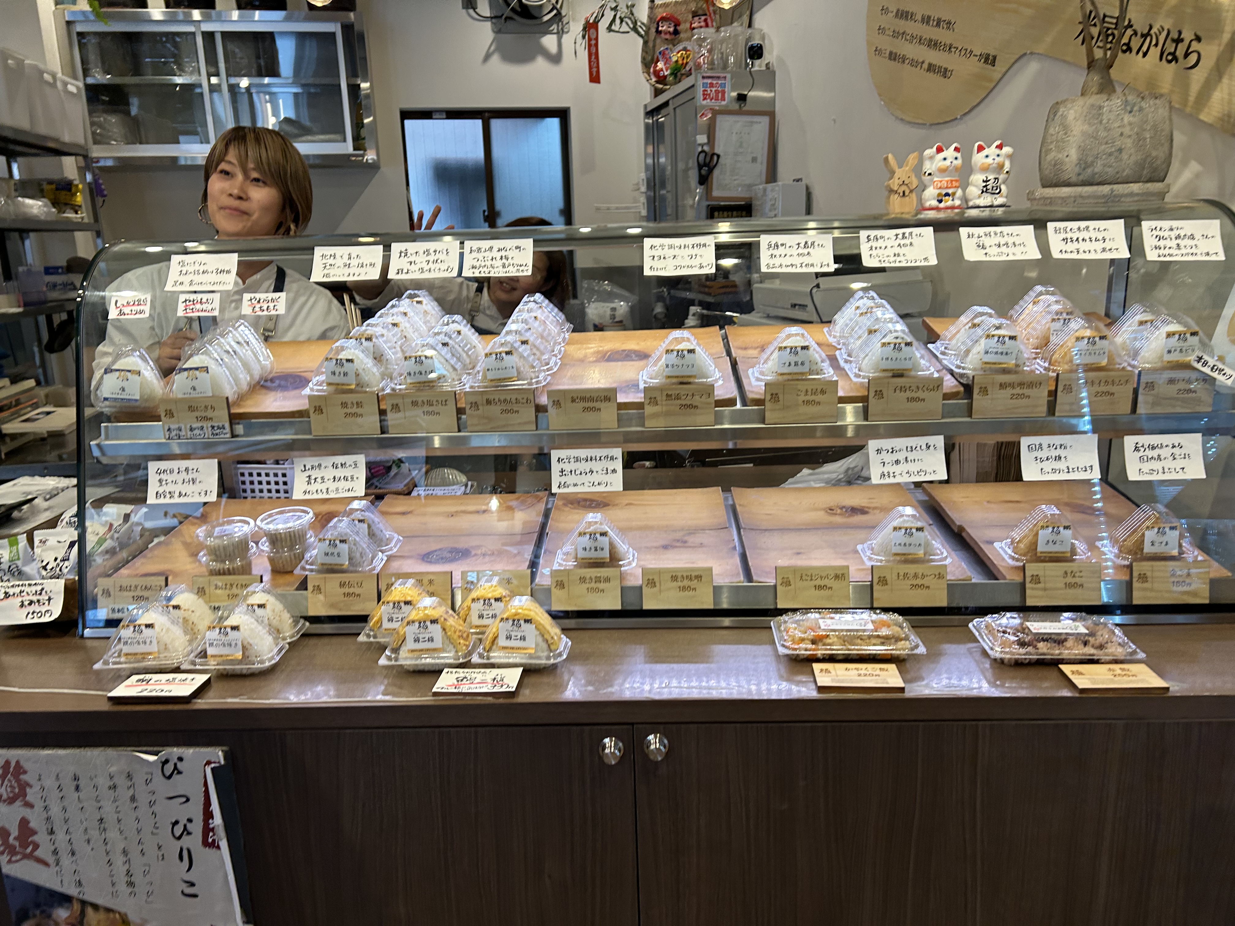 카운터에 주먹밥과 팥찰밥을 팔고 있어요.